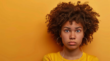 Young African American woman looking at the camera has a sarcastic expression listening to something. generative ai