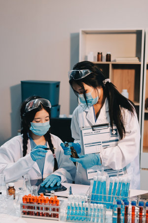 Gifted Asian scientist wearing rubber gloves and safety masks working together on creation of cancer vaccine, interior of dark laboratory on background