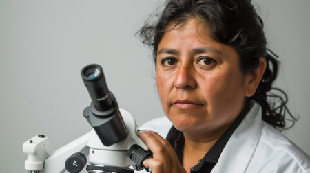 Hispanic Female Scientist in Lab Coat Holding Microscope Portrait Shot