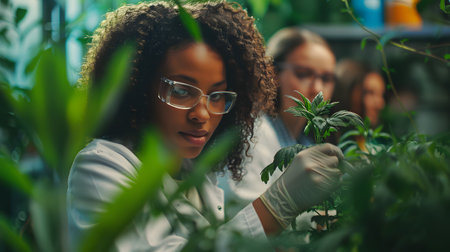 Young female scientist in lab coat and glasses working with plants in test tubes