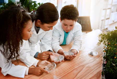 Where they learned to appreciate life. an adorable little boy and girl learning about plants with their teacher at school.