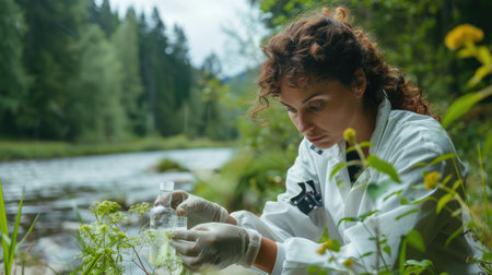 An environmental scientist in protective gear collects a water sample from a riverbank, focusing on assessing pollution levels and ensuring ecosystem health.