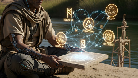 A person in a desert landscape holds a tablet displaying a holographic diagram of resource...