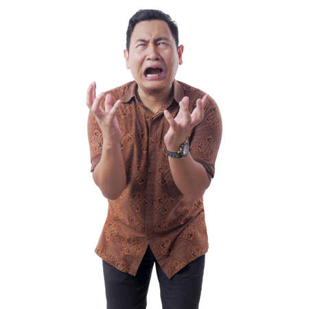 Portrait of young Asian man wearing batik shirt crying close his eyes, sad depression frustration hopeless expression, isolated on white