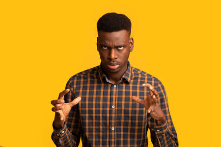 Portrait of annoyed black guy in checkered shirt emotionally gesturing, raising hands and rolling eyes with rage, feeling angry and stressed while standing isolated over yellow background, copy space