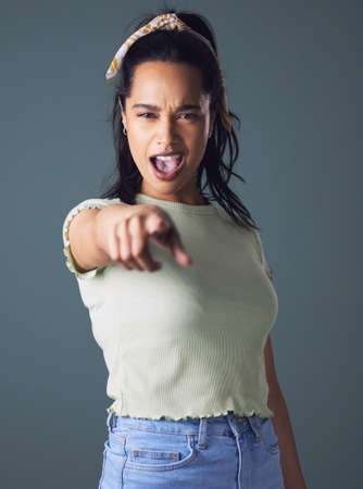 a Hispanic woman expressing anger on a studio background