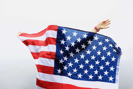 Man holding american USA flag. Independence Day or traveling in America concept.