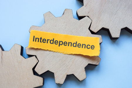Gear mechanism with the word interdependence. Represents teamwork and system connectivity.