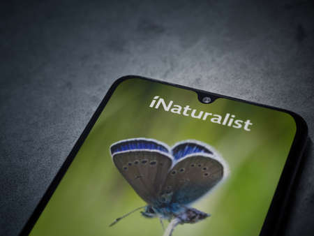 Lod, Israel - July 8, 2020: iNaturalist app launch screen with logo on the display of a black mobile smartphone on a dark marble stone background. Top view flat lay with copy space.