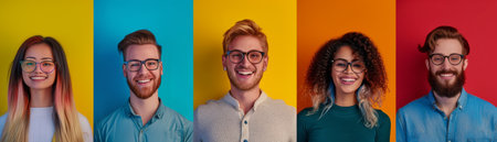 Five diverse people wearing glasses smile against a colorful background.