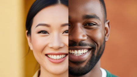 This composite image presents close-up portraits of two individuals, each with a bright smile. The composition highlights the juxtaposition of different skin tones and facial features. The soft lighting and shallow depth of field draw focus to the expressions. Suitable for use in projects related to diversity and positive emotions.