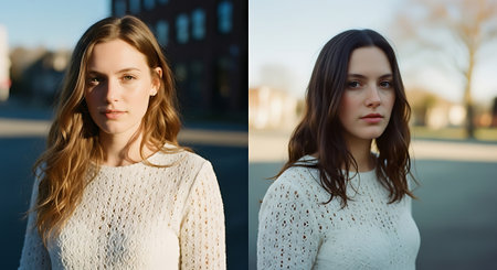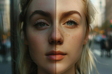 The image depicts two halves of womens faces merged together, showcasing a unique split visual, A face that is split down the middle, showing two different expressions