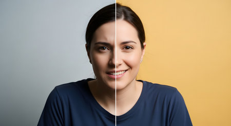 A composite portrait of a woman's face split in two, showing a contrast. One side has a worried expression against a cool background, while the other is smiling against a warm background, representing mood change or a before-and-after transformation.