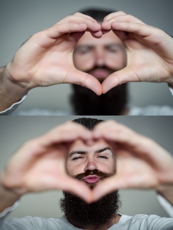handsome young man collage with long beard and moustache on face holding hands in heart shape on grey background in studio
