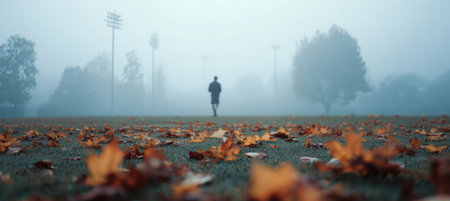 A football coach stands distantly across a wide field, with autumn leaves scattered on the grass. The scene captures poetic sports minimalism in soft, cinematic lighting.