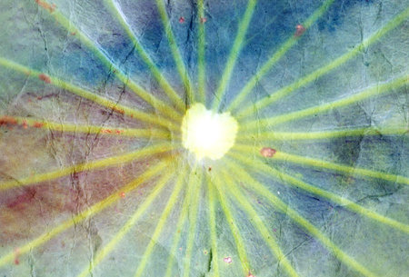 Abstract nature background with blue rays. Leaves with experimental colors.