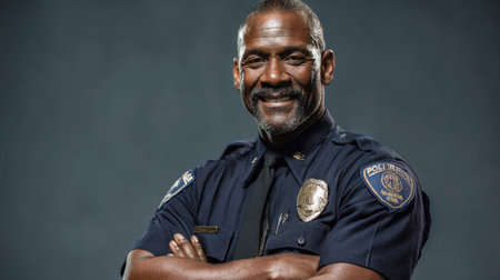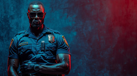 Professional Police Officer with Crossed Arms Looking at the Camera. Cop Maintains public order and safety, Enforcing the Law, Prevents and Investigates Criminal Activity. Cinematic Portrait