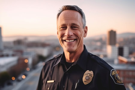 Portrait of smiling mature male police officer standing on rooftop and looking at camera