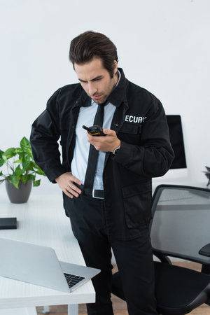 security man in black uniform calling on walkie-talkie while standing with hand on hip in office