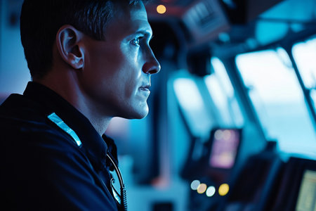 Captain and navigation officer oversee cargo operations on a large cruise ship s control room