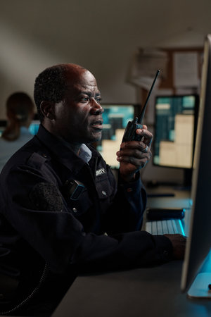 Mature African American security guard in black uniform looking at desktop computer screen while speaking on walkie-talkie