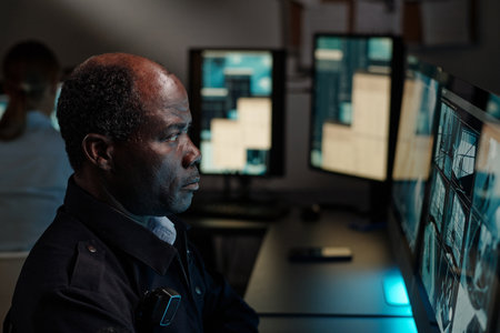 Mature African American security guard concentrating on watching cctv video on computer screen in surveillance room