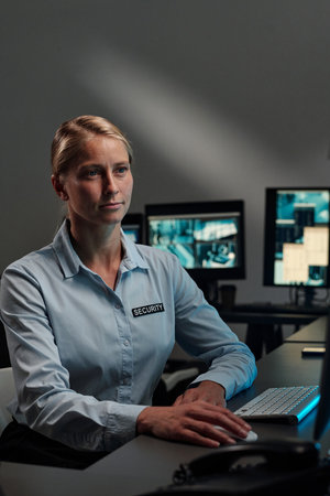 Young serious Hispanic female security guard in uniform looking at you while standing by workplace in surveillance room with cctv system