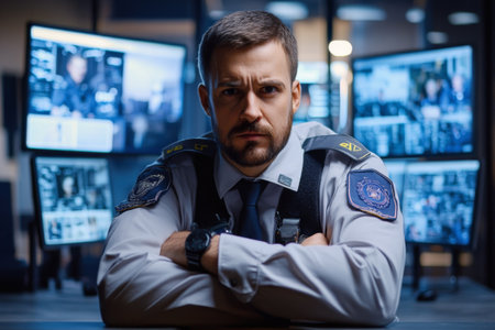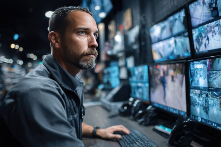 Focused security professional monitoring multiple cctv screens in a modern surveillance room, ensuring safety and preventing incidents