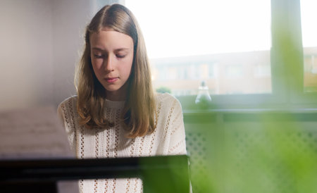 Teenage girl playing electronic musical instrument at home.