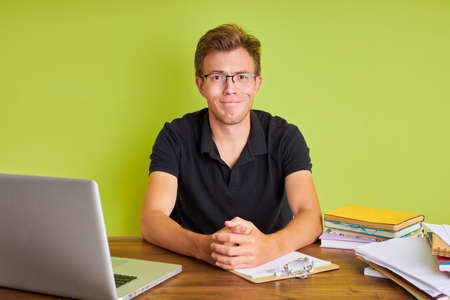 portrait of satisfied caucasian male boss with laptop at office desk, he sits looking at camera, holding interview for employees. isolated green background