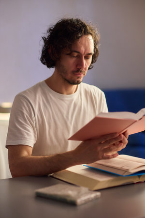 Studying the material, a student with glasses reads a textbook at the table