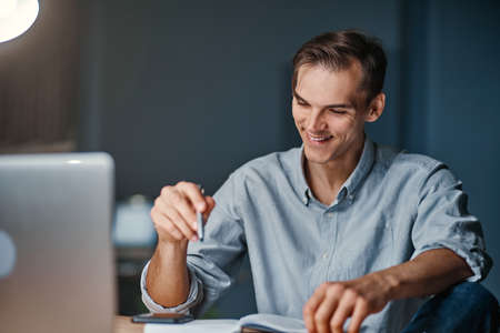 smiling businessman working on a new project at night .