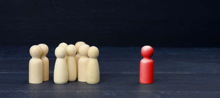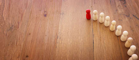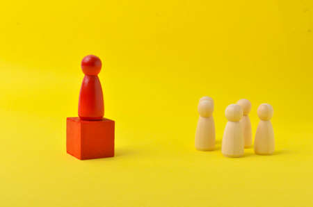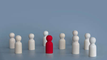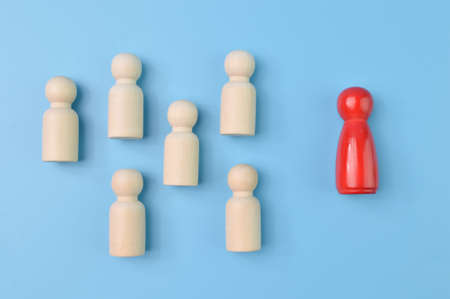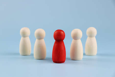 A red wooden people figure standing with a team to influence and empowerment. Leadership, talented, successful people and unique concept.