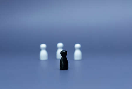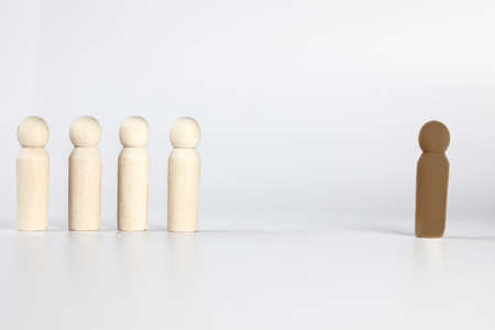 Discrimination, one black person left out of white group, standing out of the crowd concept. Racism isolated on white background