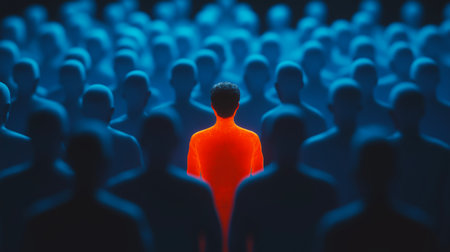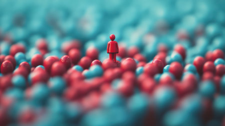 Unique Individual Standing Out in a Crowd of Abstract Figures in Red and Blue Tones
