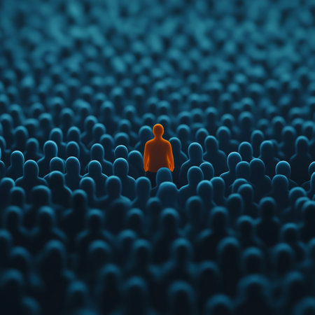 Bright figure standing out from a group, symbolizing uniqueness and career advancement.