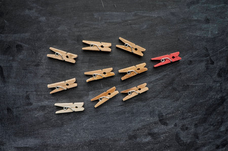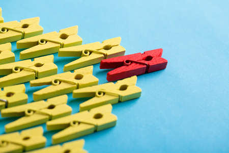 Stand out from the crowd and different concept. Leadership and other similar concepts. One red clothespin stands out from other yellow clothespins on blue background.