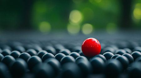 A vibrant red sphere stands out among a sea of dark, textured spheres, creating a visual metaphor for individuality, uniqueness, and standing out from the crowd.