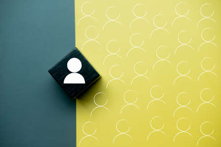 Black wooden block with people icon and many icons on yellow background, representing a group of people. Leadership, recruitment, management or human resources concepts. Employment choice concept