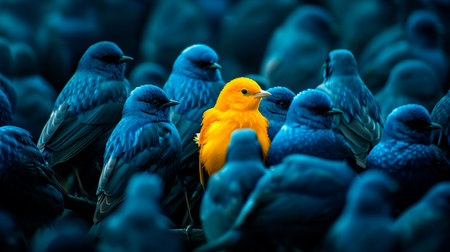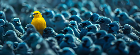 Standing Out: The Yellow Bird Amongst Blue Birds Representing Individuality and Courage. Concept Individuality, Courage, Standing Out, Yellow Bird, Blue Birds