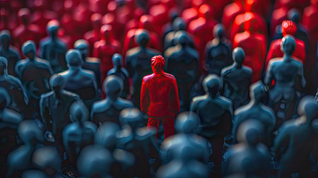 Red figure standing among black figures, symbolizing individuality and standing out in a crowd. Concept of uniqueness and identity in society.