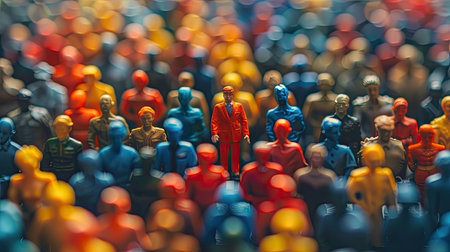Lone Red Figure in a Crowd of Plastic Figures with Vibrant Colors and Bokeh Background
