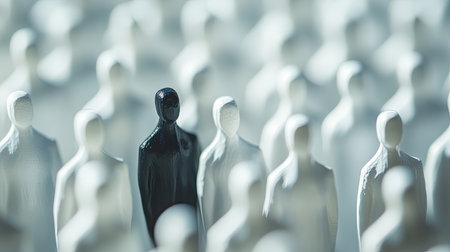 This image depicts a striking contrast between a single black figure and a multitude of white silhouettes, symbolizing individuality in a crowded world.