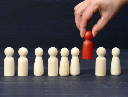 a female hand holds a wooden red figurine chosen from the crowd. The concept of finding talented employees, managers, career growth. Staff recruitment
