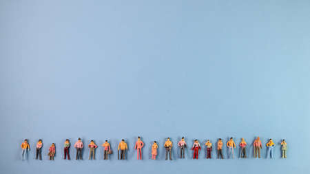 Miniature human figure figurine male female doll row line border copy text sign space on blue paper background