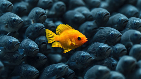 A lone brightly colored fish swimming among a group of identical fish, symbolizing standing out