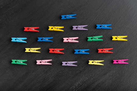 Several multicolored clothespins lies are in one direction on black background. Diversity.