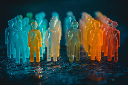 A joyful arrangement of colorful toy figures in a precise lineup, each representing individuality yet united in purpose, ideal for conveying themes of diversity and unity, banner