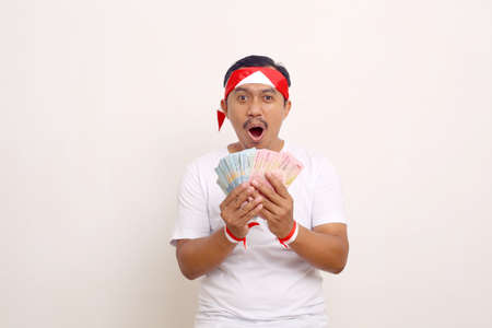 Wow expression of asian man while standing and holding indonesian banknotes.Independence day concept