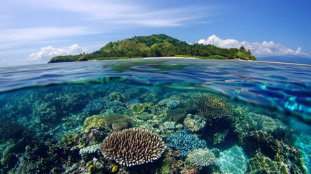 Stunning underwater view of a vibrant coral reef beneath crystal-clear water, showcasing the rich marine life and a tranquil island backdrop under a bright blue sky.